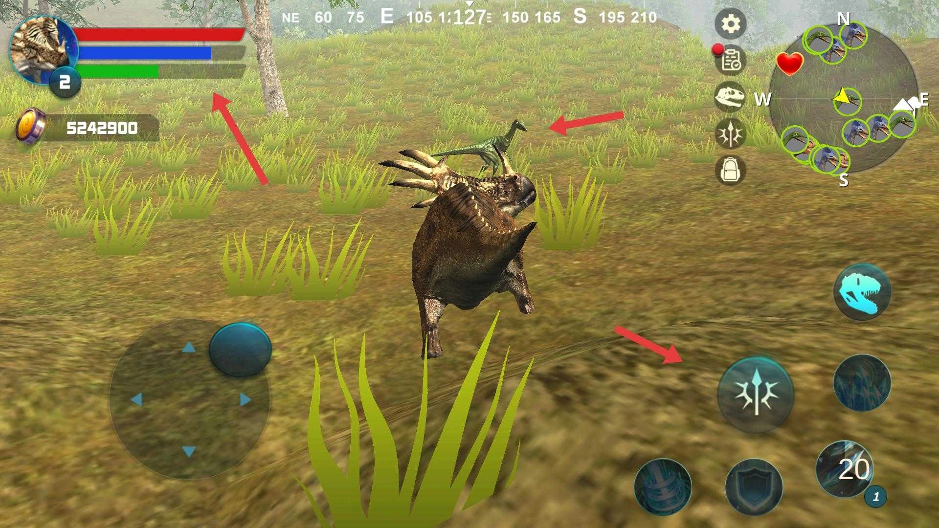 3、模拟场景里操控恐龙,界面有方向键和技能按钮,遇到其他恐龙时,可点击技能按钮发起攻击,同时关注自身状态。