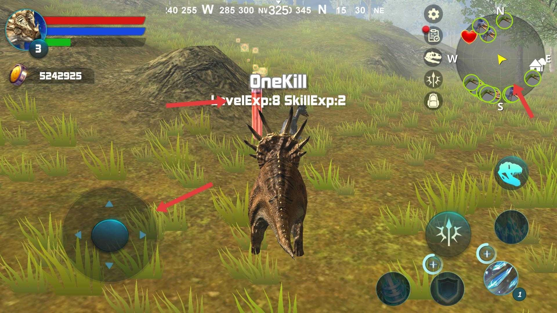 4、成功击败其他恐龙后,会显示OneKill等提示,获得经验值,继续在场景里探索,还能前往不同区域,体验更多模拟内容。