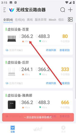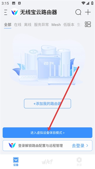 1、在【无线宝云路由器】界面中,找到并点击【进入虚拟设备体验模式】按钮,即可进入虚拟设备体验界面。
