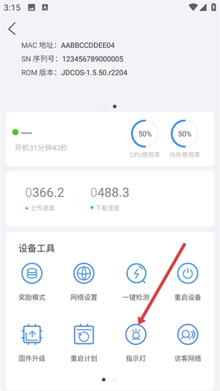 3、进入设备详情页后,在【设备工具】区域找到并点击【指示灯】选项,进入指示灯设置界面。