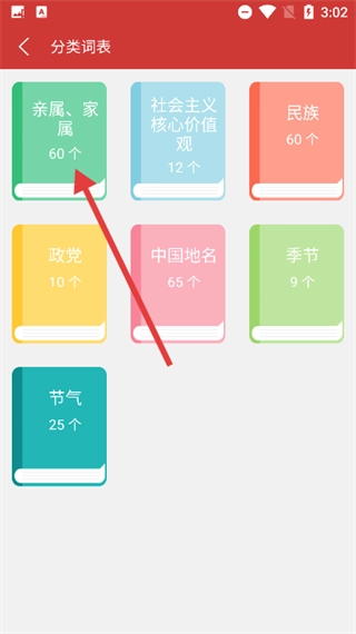 3、在【亲属、家属】词汇列表中,点击具体词汇如【亲属(亲戚、戚)】,可进入该词汇的详情页。
