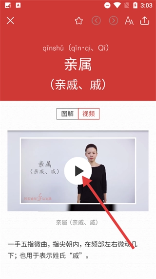 4、在词汇详情页,点击视频播放按钮,可观看【亲属(亲戚、戚)】的手语演示视频,学习其手语动作。