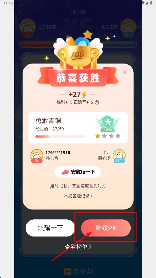 4、答题结束后,可查看结果,点击【继续PK-功能按钮】可再次参与PK。