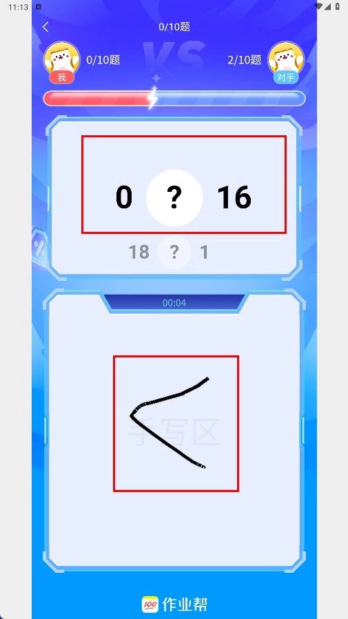 3、在答题界面,根据题目在手写区书写比较符号,完成答题如16大于0。